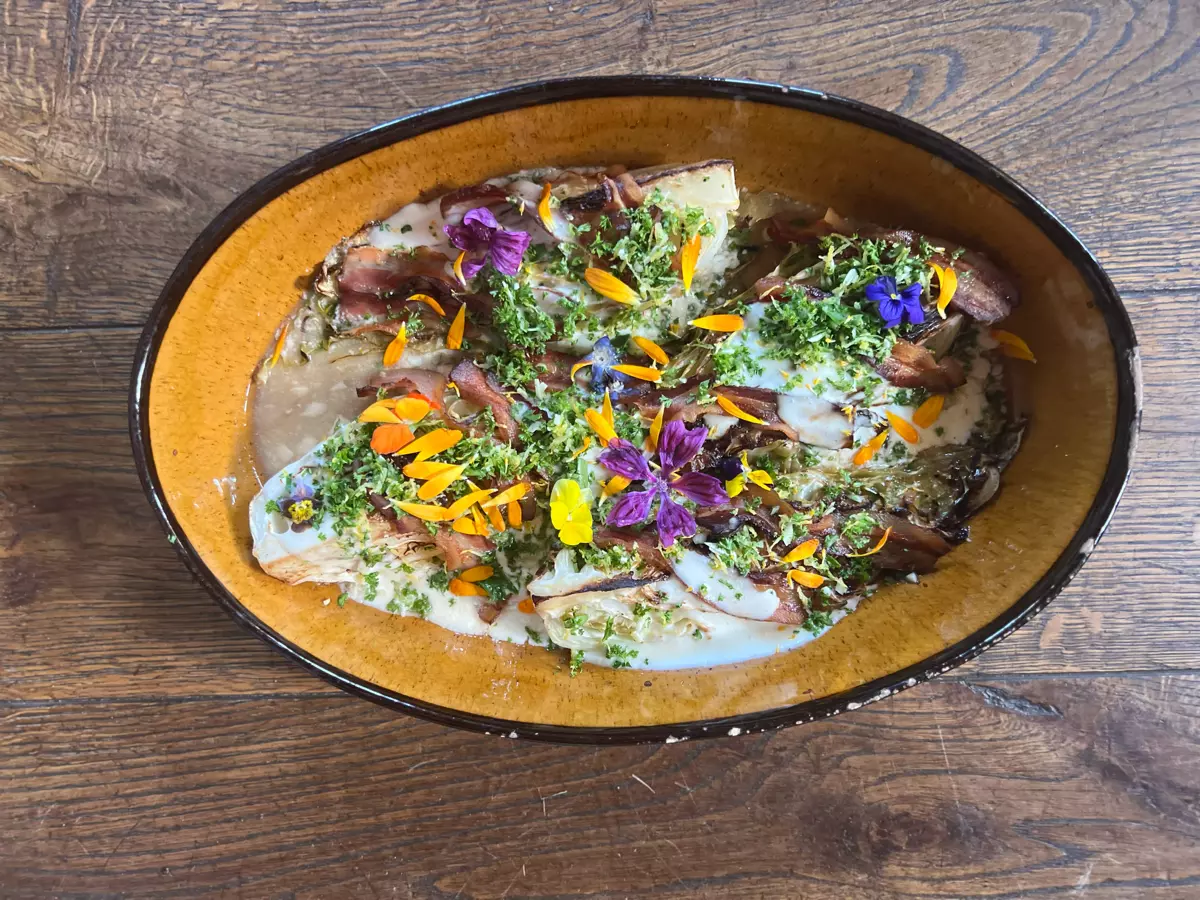 Ofenspitzkohl mit Salzzitrone, Knusperspeck und Gremolata